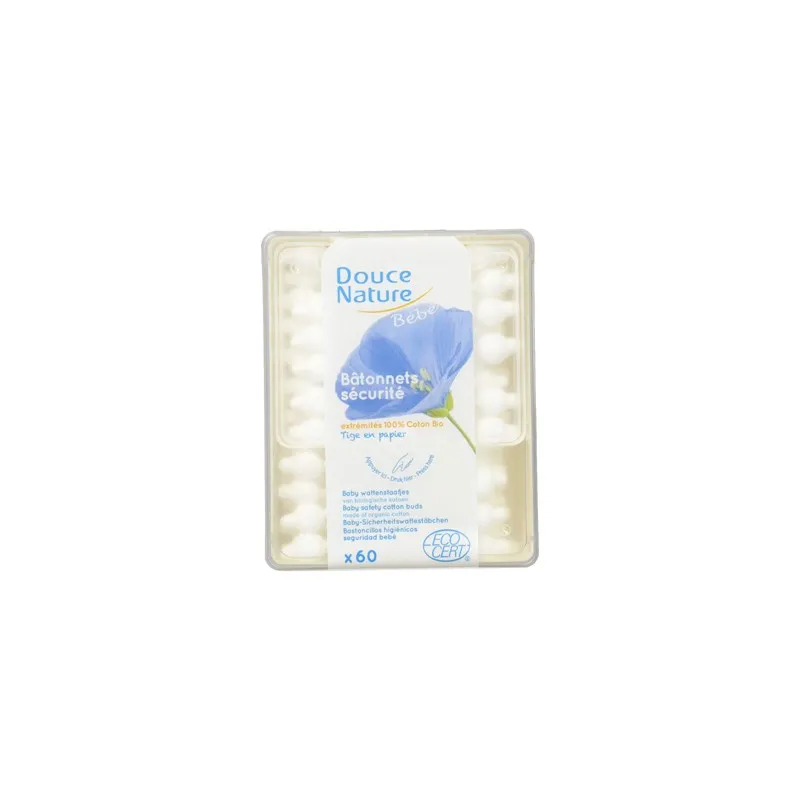 Envase de plástico sellado con 60 bastoncillos con tope de seguridad y puntas de algodón 100% orgánico.