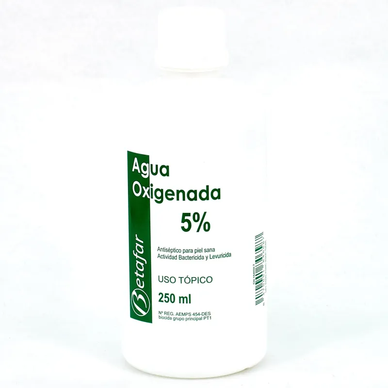 Betafar Agua Oxigenada 5%presenta un envase tipo botella de 250 ml con tapa enroscable.