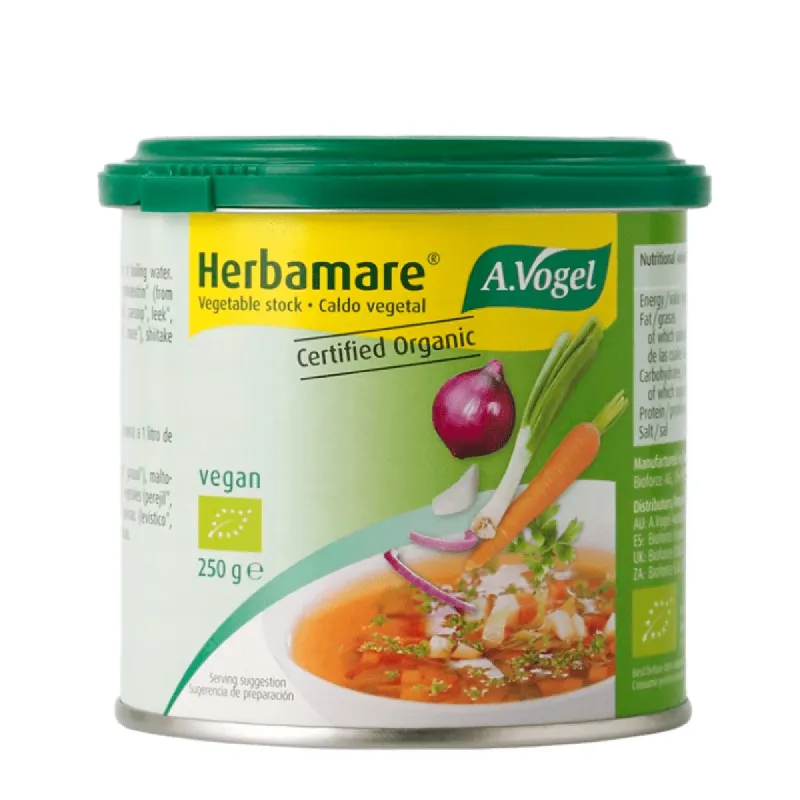 A. Vogel Herbamare Caldo Vegetal es una mezcla en polvo elaborada con hortalizas, verduras y hierbas aromáticas procedentes de agricultura biológica. Está diseñada para potenciar sabor y aroma de sopas, arroces, pastas, salsas y guisos, ofreciendo un fondo de cultivo vegetal apto para veganos y sin uso de potenciadores del sabor.
