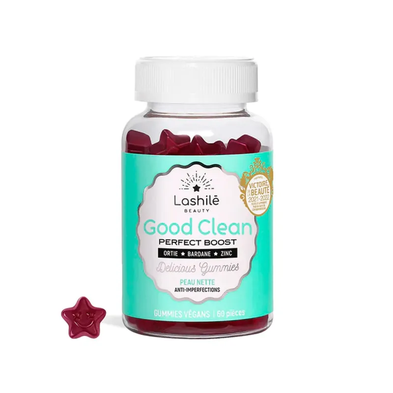 Lashilé Beauty Good Clean es un complemento alimenticio en formato gominola, desarrollado para aportar nutrientes y extractos vegetales que contribuyen al mantenimiento de una piel limpia y equilibrada. Cada gominola combina ingredientes seleccionados por sus funciones en la matriz cutánea y en el equilibrio de la seborrea, con un agradable sabor a grosella. El formato vegano y libre de gluten facilita su ingesta diaria en cualquier rutina de cuidado personal.