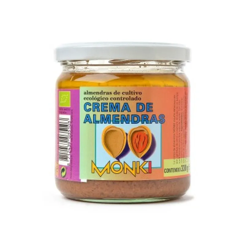 Monki Crema de almendras BIO es una crema elaborada con almendras de cultivo ecológico, trituradas hasta obtener una textura suave y homogénea. Apta para dietas veganas y vegetarianas.