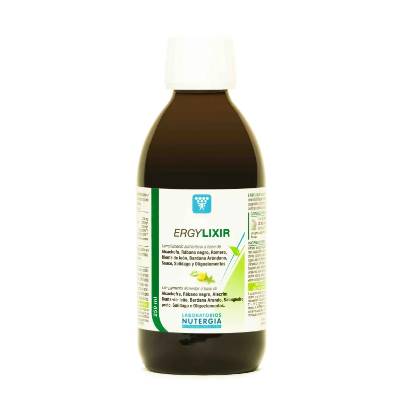 Ergylixir es un complemento alimenticio en forma líquida que combina extractos de alcachofa, arándano rojo, bardana, diente de león y romero con oligoelementos como selenio y molibdeno. Se presenta en envase de 250 ml con tapón dosificador, diseñado para ajustar la toma diaria entre 10 y 30 ml según las necesidades.