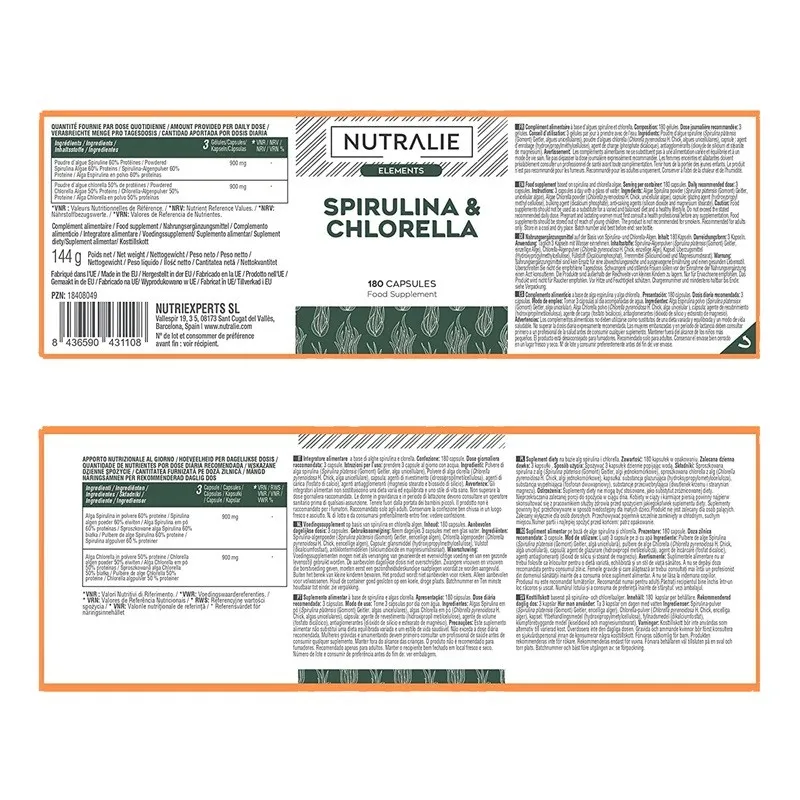 La espirulina es un alga unicelular rica en proteínas de alto valor biológico, vitaminas del grupo B, hierro y antioxidantes, ingredientes que contribuyen al normal metabolismo energético y a la protección de las células frente al daño oxidativo. La chlorella, otra microalga, aporta clorofila, vitaminas, minerales y fibra, favoreciendo las funciones depurativas y la nutrición celular.