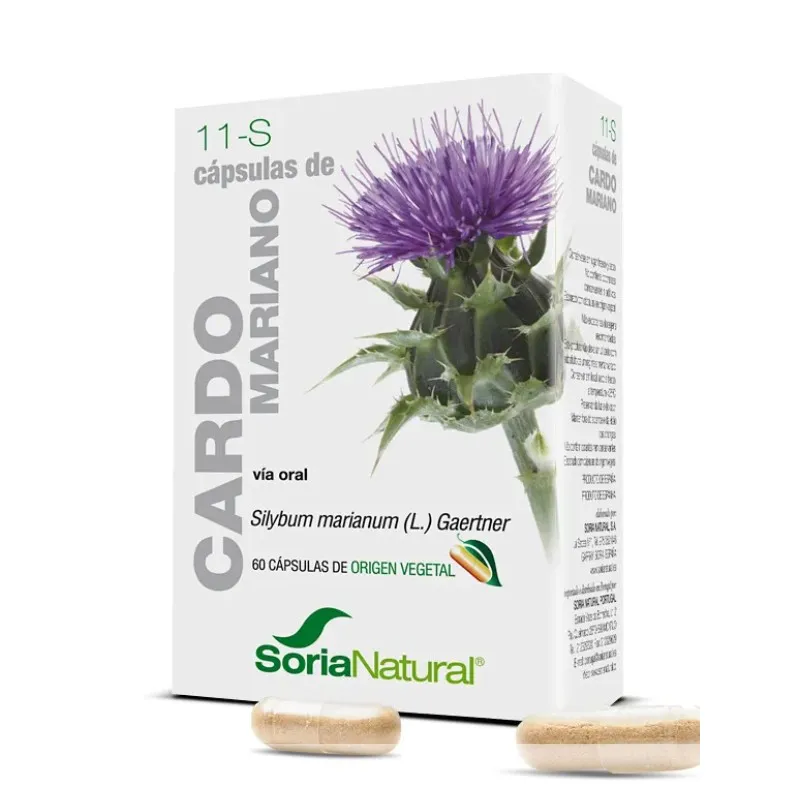Soria Natural 11-S Cardo Mariano es un complemento alimenticio en cápsulas formulado con extracto seco de semillas de Silybum marianum. Presentado en envase de 30 cápsulas, este producto está dirigido a quienes desean apoyar las funciones naturales del hígado y mantener el equilibrio antioxidante. Su contenido en silimarina, un conjunto de flavonolignanos, contribuye a la protección de las células hepáticas frente al estrés oxidativo y favorece los mecanismos de regeneración tisular.