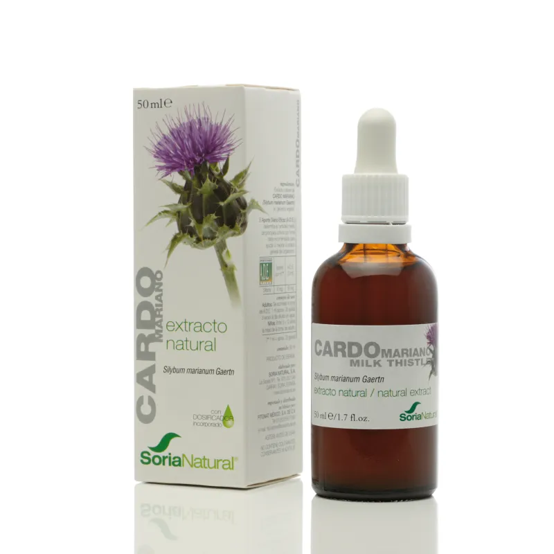 Soria Natural Cardo Mariano Extracto Natural es un complemento alimenticio formulado con extracto de Carduus marianus estandarizado en silimarina. Se ofrece en formato líquido para facilitar la administración y absorción de sus componentes en diferentes situaciones de apoyo a la función hepática.