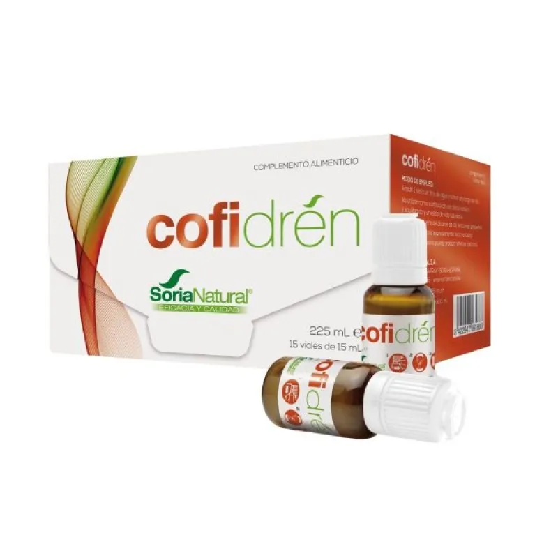 Soria Natural Cofidren es un complemento alimenticio líquido en formato de 15 viales de dosis diaria prefijada. Cada vial contiene extracto de café verde y diente de león, ingredientes que, según la normativa vigente, contribuyen a la depuración corporal y al control del equilibrio hídrico. Este producto está concebido para integrarse en dietas equilibradas y programas de estilo de vida saludable, aportando un soporte a las funciones naturales de drenaje y limpieza del organismo.