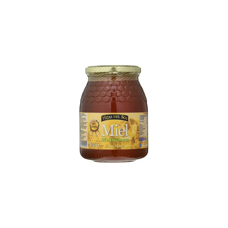 La miel multiflor Hijas del Sol es un producto natural recolectado por abejas de distintas especies florales. Se presenta en un tarro de 1 kg y destaca por su color dorado y su sabor dulce con matices florales. Se emplea como sustituto de azúcar en bebidas, cereales, postres y recetas de cocina.