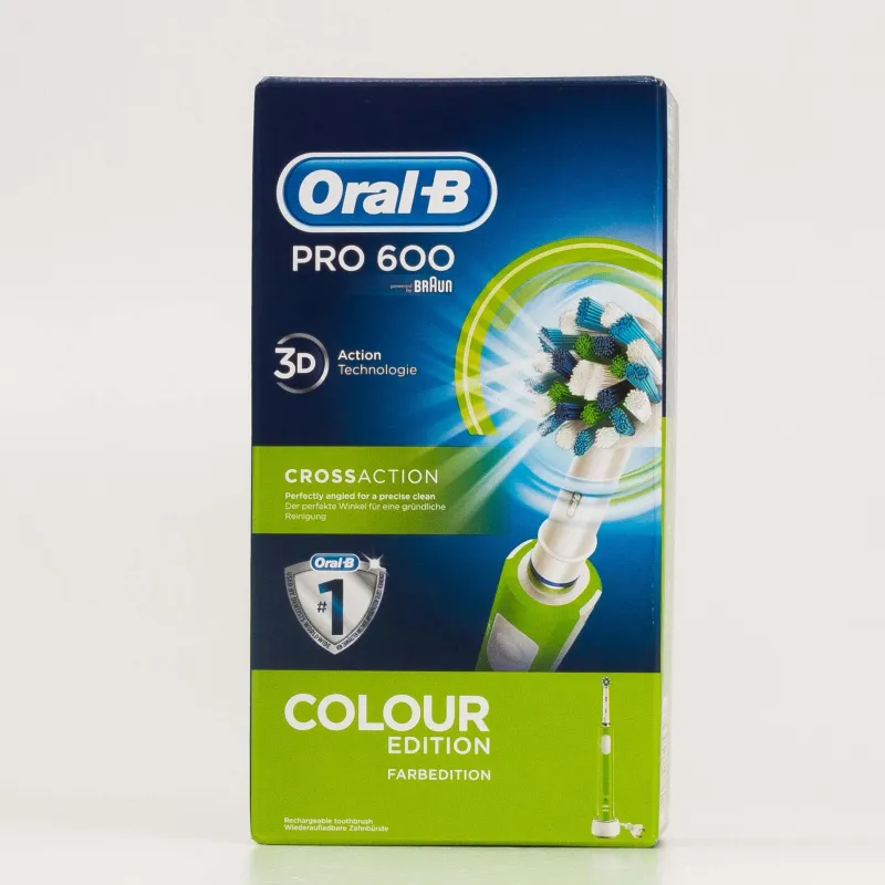 El Cepillo oral B pro 600 cabezal crossaction, cuenta con un temporizador con el que el usuario se puede guiar para durar los dos minutos de cepillado recomendado por los dentistas, brindando una velocidad de limpieza de 20.000 oscilaciones por minuto. Posee una pila recargable, que posee una duración de 7 a 10 días, teniendo en cuenta el uso diario recomendado por los especialistas.