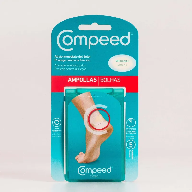 Los apósitos adhesivos medianos Compeed para ampollas tienen unas medidas de 4,2 x 6,8 cm, se presentan en un envase que contiene 5 unidades.