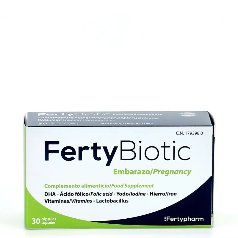 Fertybiotic Embarazo es un suplemento alimenticio especialmente formulado para aportar nutrientes y probióticos durante la etapa preconcepcional, el embarazo y la lactancia. Contiene una combinación de vitaminas, minerales y cepas de Lactobacillus, cuyos componentes participan en el desarrollo normal del sistema nervioso, óseo, inmunitario y en el equilibrio de la flora vaginal. El producto contribuye a suministrar requisitos nutricionales que aumentan durante estas fases, ayudando a cubrir las necesidades diarias.
