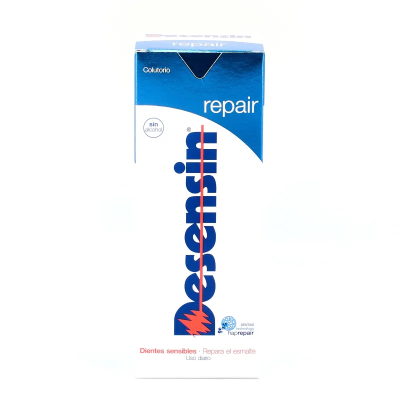 El colutorio Desensin Repair ayuda a eliminar el dolor, repara y devuelve minerales a los dientes, contribuye a luchar contra la formación de caries y repara las encías.
