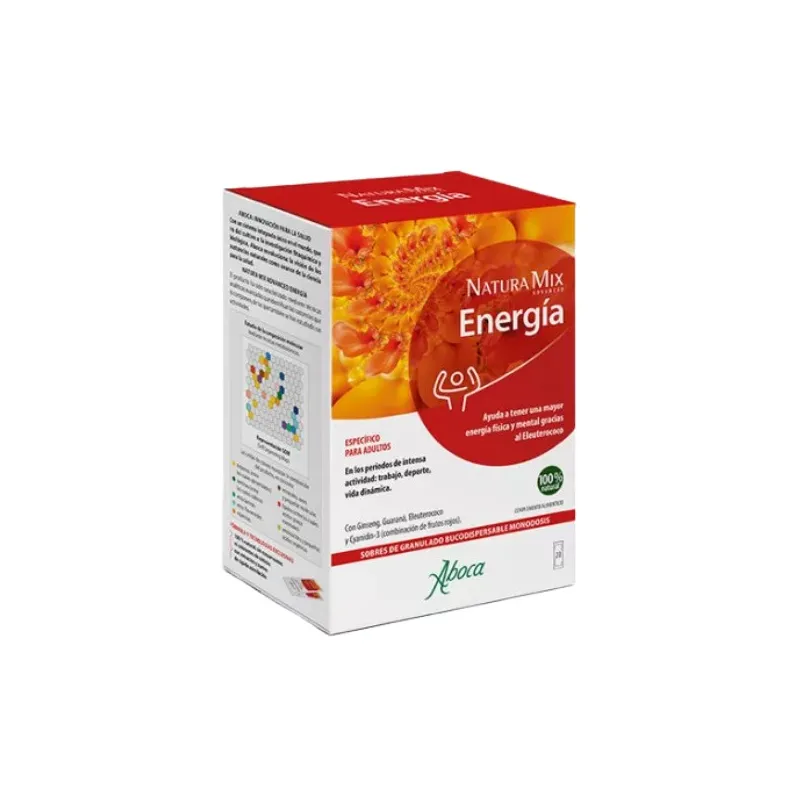 Aboca Natura Mix Advanced Energía es un complemento alimenticio en formato líquido que combina extractos estandarizados de Eleuterococo, Ginseng, Guaraná y fuentes naturales de Cyanidin-3. Cada frasco aporta principios activos obtenidos de plantas medicinales y jugos concentrados de frutos rojos, adecuadamente dosificados para contribuir a mantener la vitalidad física y mental en momentos de alta demanda. Esta formulación está concebida para adultos que afrontan entrenamientos exigentes, jornadas laborales prolongadas, etapas de estudio intenso o situaciones de estrés elevado.