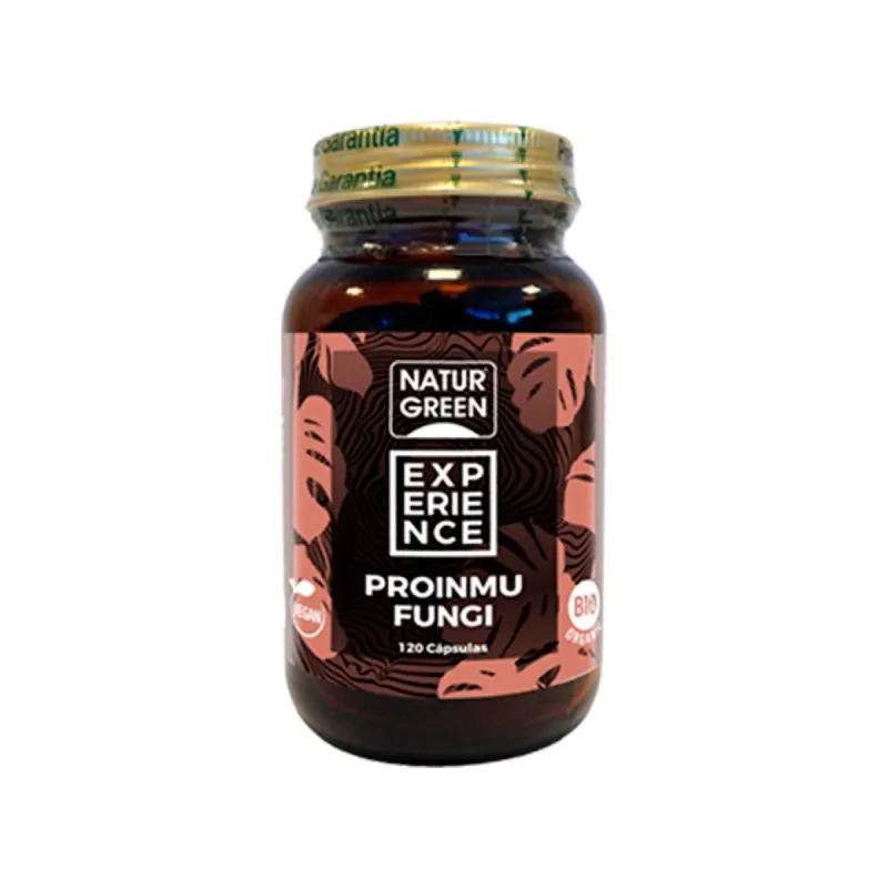 Natur Green Experience Proinmu Fungi es un complemento alimenticio en cápsulas vegetales que aporta extractos de hongos ecológicos, entre ellos cordyceps, maitake, Inonotus obliquus (chaga) y reishi, junto a polisacáridos naturales. Su formulación está orientada a complementar la dieta con compuestos bioactivos procedentes de hongos, que participan de forma natural en el funcionamiento normal del sistema inmunitario y el bienestar general. El producto es apto para veganos, libre de gluten, sin lactosa ni azúcares añadidos y no contiene colorantes ni conservantes artificiales.