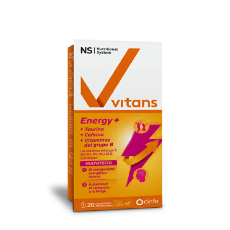 NS Vitans Energy+ Diario es un complemento alimenticio en comprimidos diseñado para aportar determinados compuestos que se encuentran de forma natural en alimentos y nutrientes que participan en funciones habituales del organismo. Está compuesto por taurina, cafeína y varias vitaminas del grupo B. Su composición permite complementar la ingesta de estos ingredientes dentro de una alimentación y estilo de vida equilibrados.