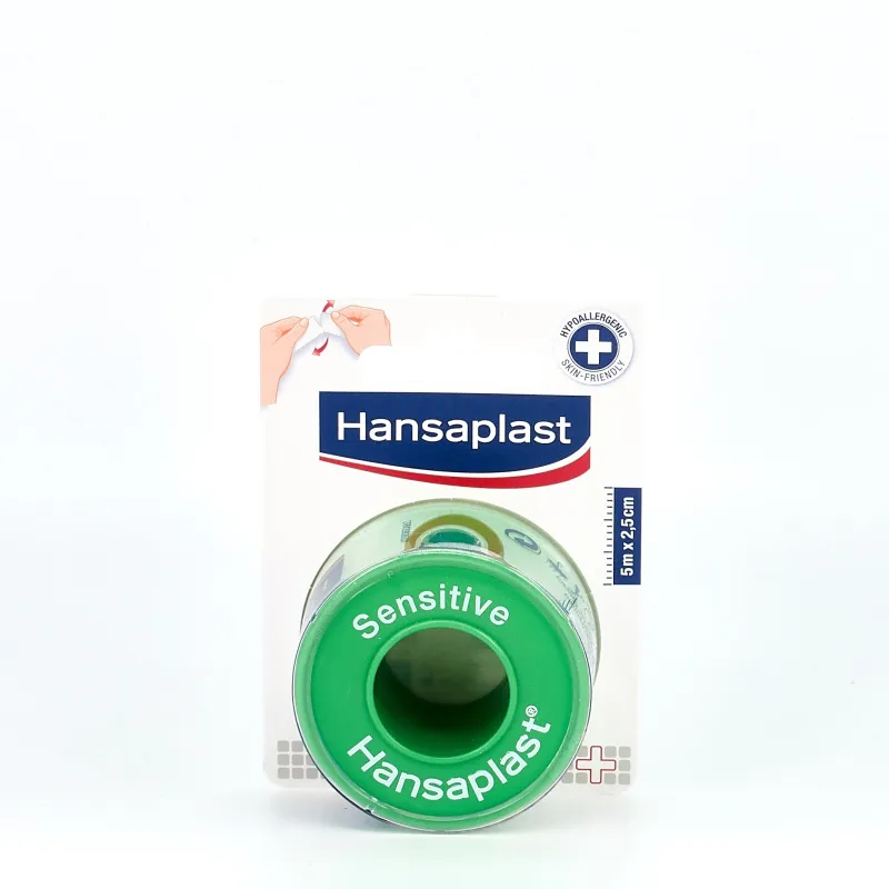Hansaplast Esparadrapo Hipoalergénico Sensitive 5 m x 2,5 cm, es una cinta que sirve para la fijación de vendas y gasas sobre la piel afectada por heridas o lesiones.