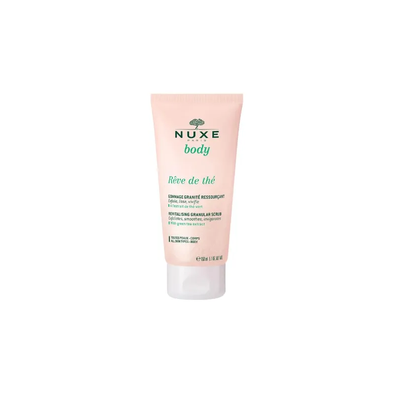Nuxe Body Rêve de Thé Exfoliante granulado revitalizante es un producto cosmético especialmente diseñado para liberar la piel de impurezas y proporcionarle frescura y suavidad. Su fórmula ultra refrescante contiene el efecto antioxidante del té verde combinado con partículas exfoliantes provenientes del bambú.