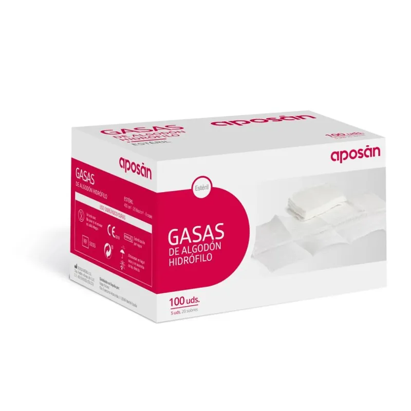 Aposan Compresa Estéril es un producto sanitario de algodón hidrófilo estéril destinado al cuidado básico de heridas y curas en el hogar o en entornos clínicos. Se presenta en 100 unidades de gasas plegadas, cada una en envoltorios individuales que mantienen su esterilidad hasta el momento de uso. Estas compresas de algodón hidrófilo han sido sometidas a procesos de limpieza y esterilización para asegurar que están libres de microorganismos y son adecuadas para la limpieza y protección de pequeñas heridas, cortes, abrasiones y para primeros auxilios. Su textura suave y absorbente ayuda a gestionar exudados superficiales y a facilitar la cobertura de zonas lesionadas con una barrera limpia.