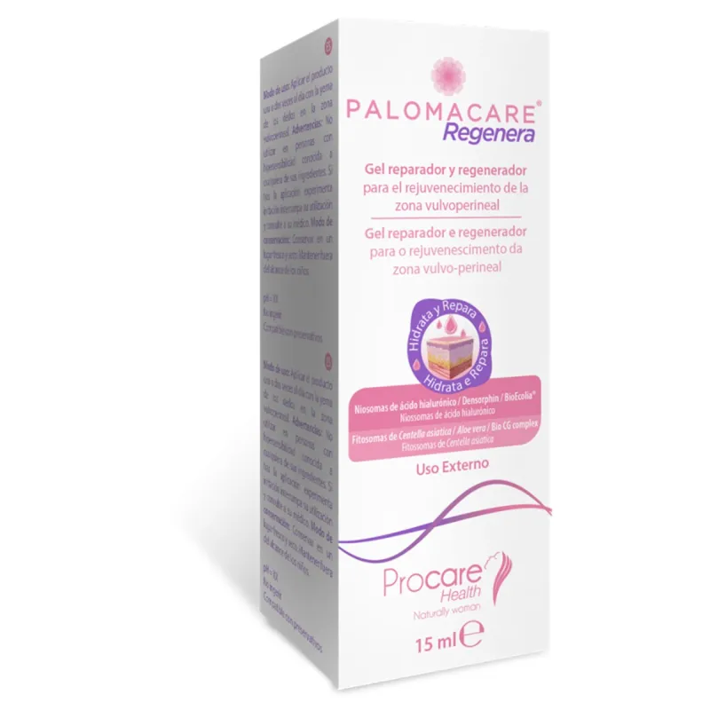Palomacare Regenera Gel Reparador es un gel diseñado para cuidar y regenerar la zona vulvoperineal. Su composición incluye ácido hialurónico, betaglucano, centella asiática, aloe vera y Bioecolia®, que actúan sinérgicamente para hidratar, reparar y proteger la mucosa genital.