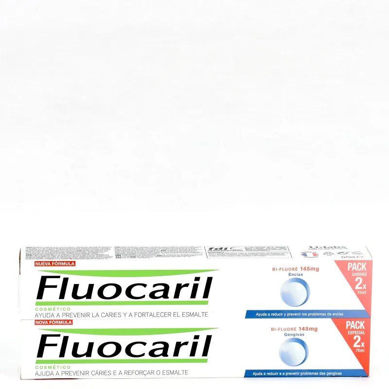 Fluocaril Bi-Fluore 145 mg Encías viene presentado en un pack de dos tubos de 75 ml cada uno.
