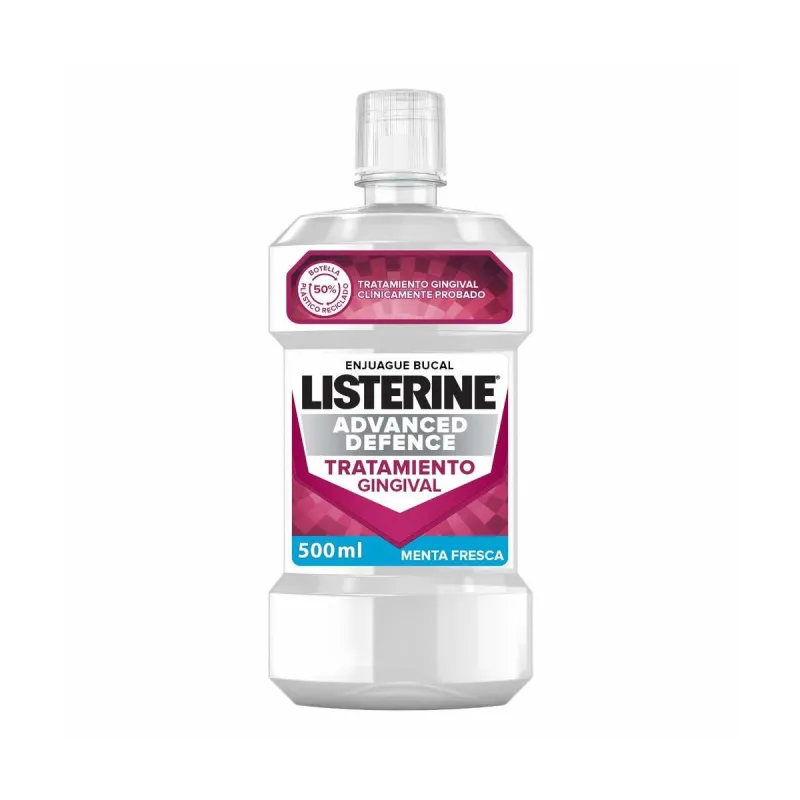 Listerine Advanced Defense tratamiento gingival menta fresca, 500 ml, es un enjuague bucal que contribuye a proteger las encías y ayuda a prevenir la formación de gingivitis.