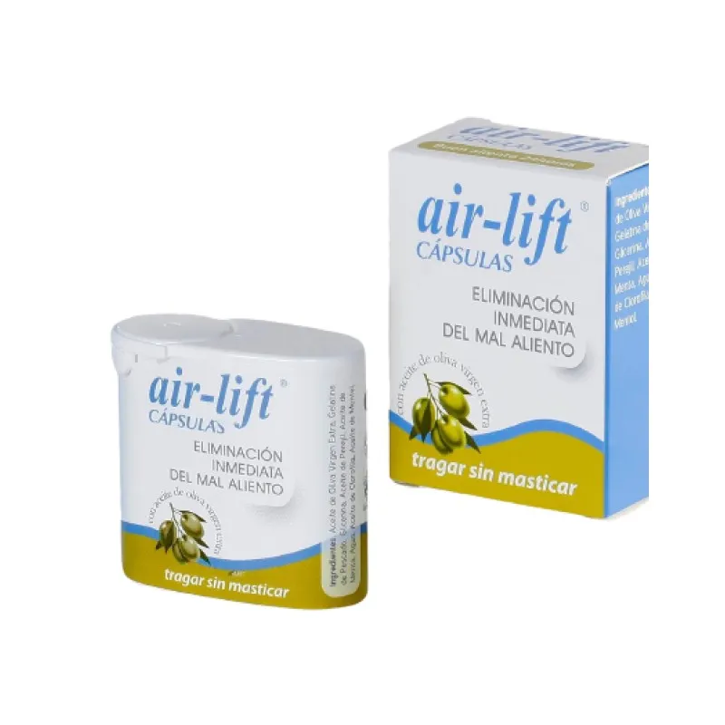 Air Lift eliminación mal aliento es un complemento alimenticio en cápsulas formulado con xilitol, flúor y aceite de oliva, que aporta sustancias asociadas al mantenimiento de la higiene bucal y la sensación de frescor. Su tamaño reducido facilita su transporte y uso en cualquier momento del día.