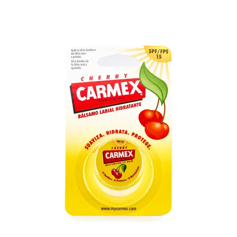 Carmex Bálsamo Labial Cherry spf15+ en tarro para reparar, nutrir, calmar y proteger los labios secos y agrietados dejándolos suaves e intensamente hidratados.