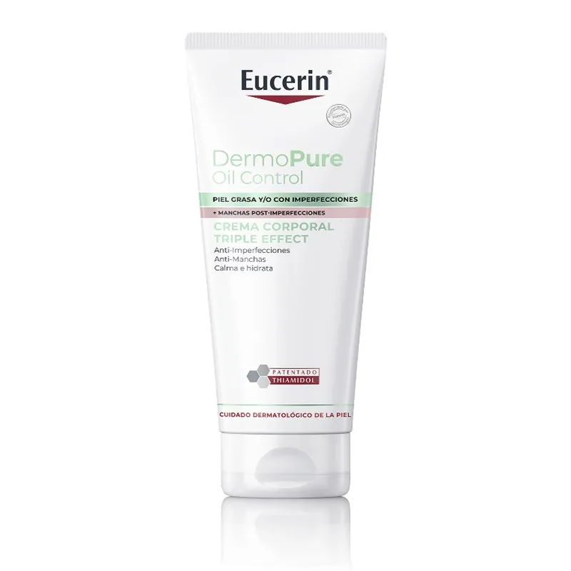 Eucerin Dermopure Oil Control Crema Corporal Triple Effect es una crema especialmente desarrollada para pieles propensas a imperfecciones y marcas post-acné en el cuerpo. Esta crema combina ingredientes activos como el Thiamidol® y el ácido salicílico para reducir visiblemente las imperfecciones y prevenir nuevas marcas, mientras hidrata y calma la piel en zonas problemáticas como la espalda, el pecho y los hombros.