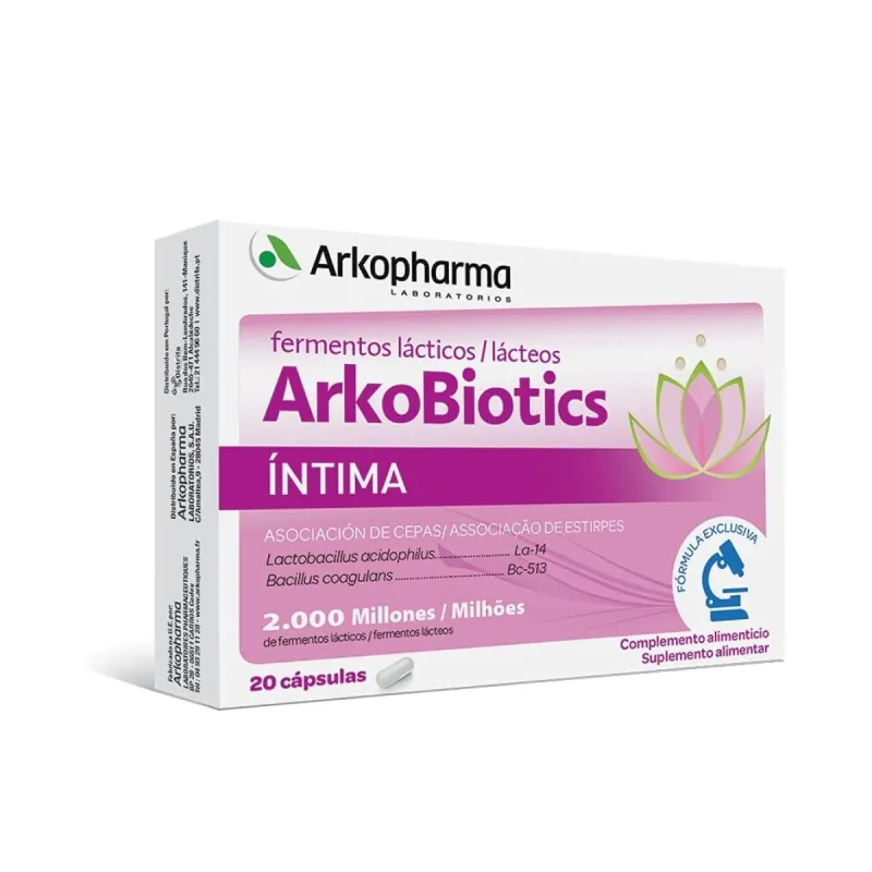 Arkopharma ArkoBiotics Intima Cuidado Flora Vaginal se presenta en envase con 20 cápsulas.