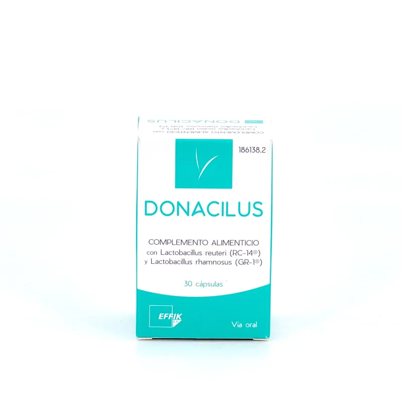 Donacilus es un complemento alimenticio en cápsulas que contiene dos cepas de Lactobacillus (reuteri RC-14 y rhamnosus GR-1), seleccionadas por su capacidad para contribuir al equilibrio de la microbiota íntima femenina. Está formulado para apoyar la proporción natural de microorganismos de la flora vaginal y favorecer el bienestar diario en situaciones de desequilibrio.
