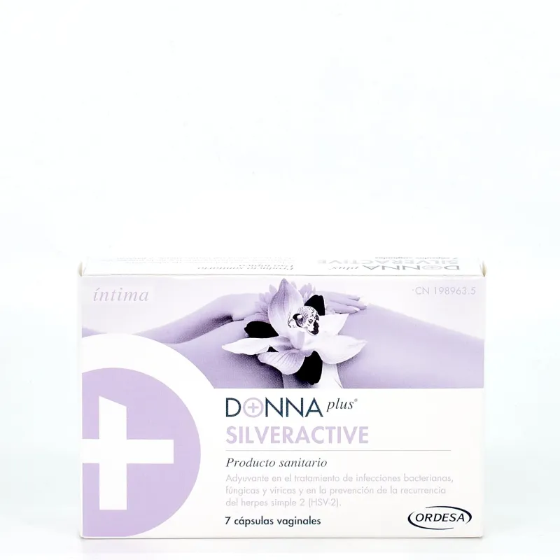 Donna Plus Silver Active, es un complemento sanitario que está elaborado con una sinérgica combinación de ácido hialurónico, aloe vera y micropartículas de plata que pueden ayudar a combatir las infecciones vaginales como la vaginosis bacteriana o candidiasis vulvovaginal.
