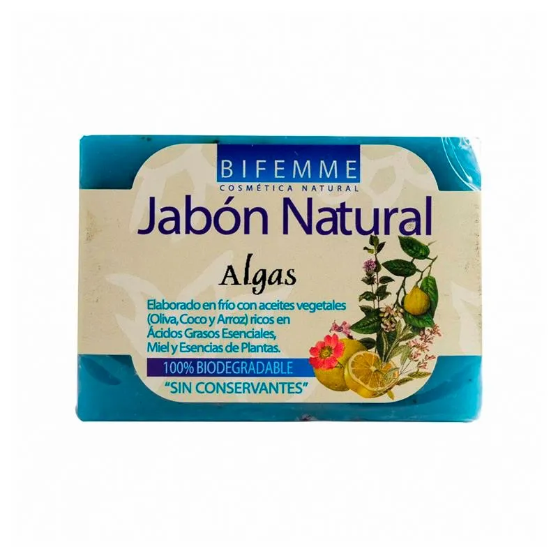 Bio-Femme Jabón Algas, 100g es un producto de higiene diaria formulado con extractos de algas marinas. Está diseñado para limpiar la piel de manera suave, contribuyendo a mantenerla fresca y con un aspecto luminoso gracias a los minerales y nutrientes presentes en las algas.