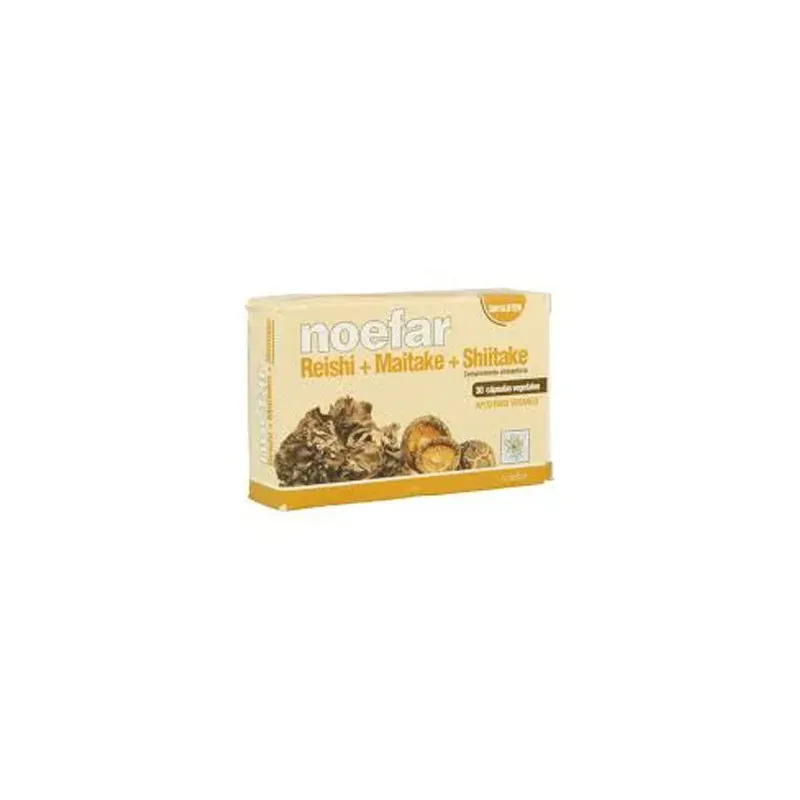 Reishi + Maitake + Shiitake 30 cápsulas de Noefar es un complemento alimenticio que combina extractos secos de los hongos Ganoderma lucidum (Reishi), Grifola frondosa (Maitake) y Lentinula edodes (Shiitake). Cada hongo aporta polisacáridos y betaglucanos específicos que se han seleccionado para contribuir al funcionamiento normal del sistema inmunitario y al bienestar general del organismo. Se presenta en cápsulas de fácil deglución.