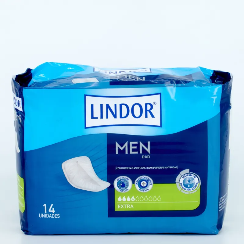 Lindor Men Absorción Extra son unas compresas ultra absorbentes que ayudan a mantener la piel limpia y seca en caso de incontinencia urinaria. Su forma anatómica se adapta a la parte frontal de la ropa interior masculina y promueve la protección activa de la piel.