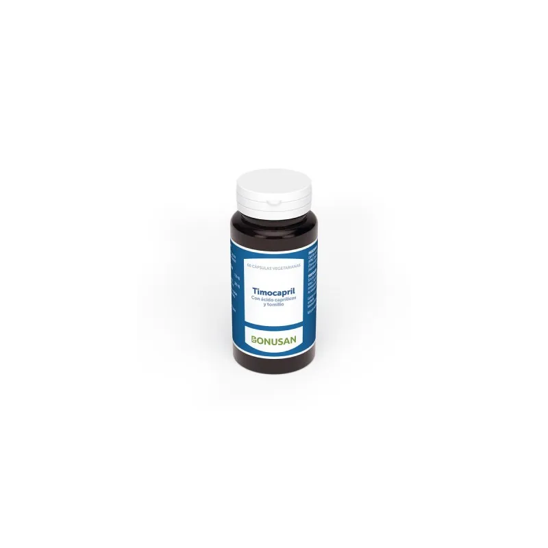 Bonusan Timocapril es un complemento alimenticio que combina ácido caprílico y extracto de tomillo (Thymus vulgaris) en cápsulas gastrorresistentes. Esta formulación está diseñada para preservar los principios activos hasta alcanzar el intestino, favoreciendo su liberación en el lugar de acción. El ácido caprílico y los compuestos fenólicos del tomillo se seleccionan por sus características de apoyo a la microbiota intestinal dentro de un estilo de vida saludable.