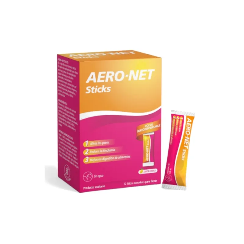 En farmacia Barata se recomienda el uso de Aero-Net 12 Sticks sabor cítrico después de las comidas para favorecer la dispersión de las burbujas de gas y mejorar el confort digestivo.