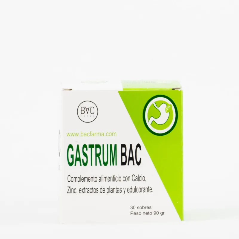 Gastrum Bac es un complemento alimenticio en polvo, presentado en sobres, que combina sales minerales y extractos de plantas para favorecer el equilibrio ácido-base en el estómago. Está formulado con carbonato cálcico, citrato de zinc y extractos de plantas seleccionadas.