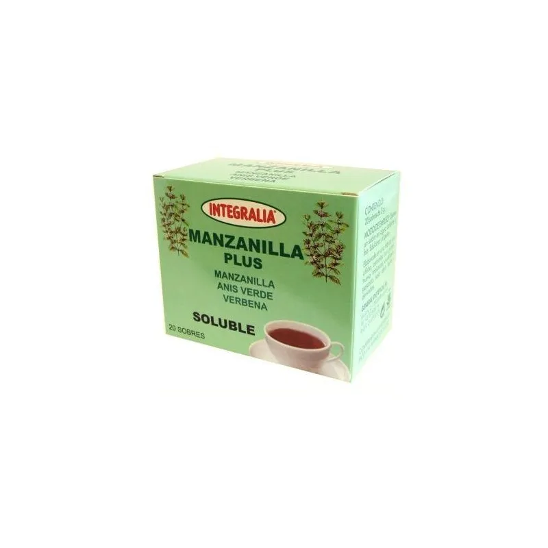 Integralia Manzanilla Plus Soluble es un complemento alimenticio en formato de sobres monodosis, elaborado a partir de extractos secos estandarizados de manzanilla (Matricaria chamomilla), anís verde (Pimpinella anisum) y verbena (Aloysia citrodora). Estos ingredientes han sido seleccionados por su contenido en componentes bioactivos que pueden contribuir al bienestar digestivo y favorecer la sensación de calma. La presentación soluble permite su consumo tanto en caliente como en frío, adaptándose a las preferencias personales y al clima de cada temporada.