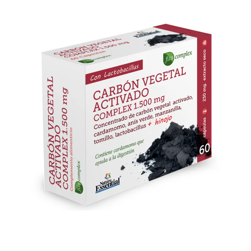 Nature Essential Carbón Complex 1.500mg, 60 cápsulas es un complemento alimenticio que combina carbón vegetal activado, cardamomo, manzanilla, anís verde, tomillo, hinojo y Lactobacillus. Sus ingredientes contribuyen al funcionamiento normal del proceso digestivo, favorecen la regulación del tránsito intestinal y ayudan a mantener el equilibrio de la flora bacteriana. Este producto está formulado para complementar una dieta equilibrada y un estilo de vida saludable, especialmente tras comidas copiosas o periodos de digestiones pesadas.