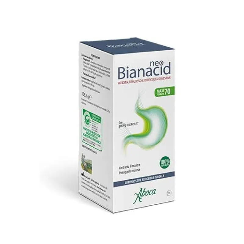 Neobianacid Reflujo es un complemento alimenticio formulado con ingredientes de origen natural, diseñado para contribuir a la protección de la mucosa del tracto gastroesofágico. Su composición incluye extractos vegetales y sustancias mucoadhesivas que participan en la formación de una capa protectora sobre el epitelio digestivo, ayudando a reducir la irritación producida por los ácidos gástricos. Se presenta en comprimidos de rápida disolución oral, aptos para su uso tras las comidas principales.