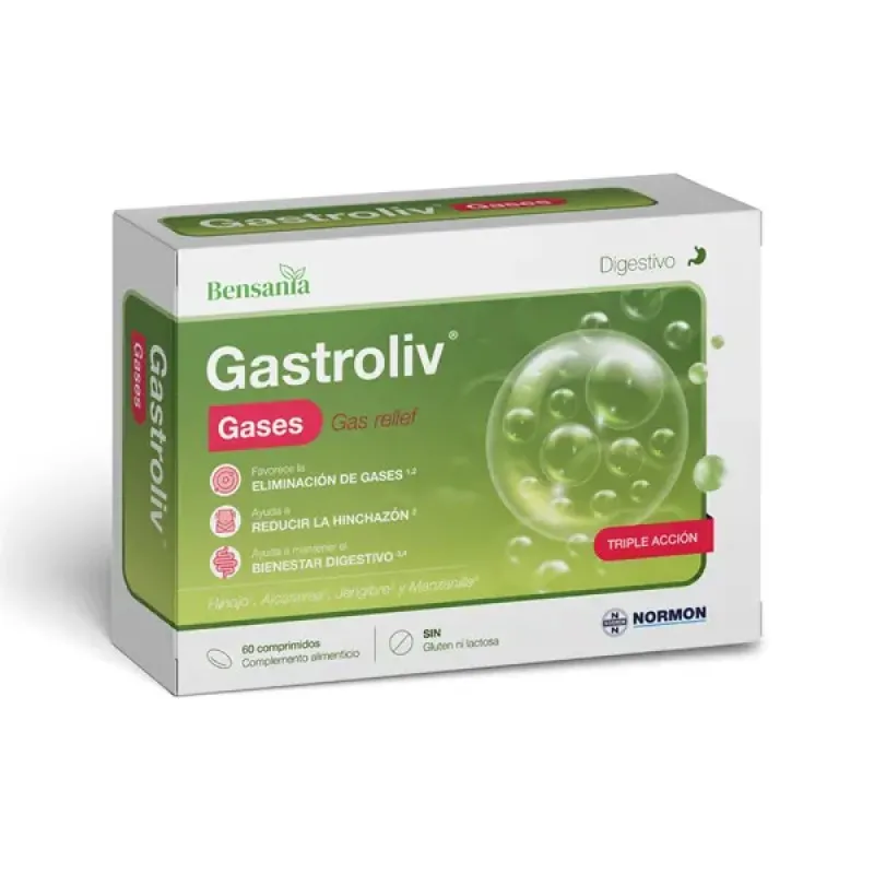 Normon Gastroliv Gases es un complemento alimenticio en comprimidos formulado para contribuir al bienestar digestivo mediante la reducción de los gases intestinales. Cada comprimido combina simeticona con extractos de hinojo, menta y melisa, seleccionados para favorecer la expulsión de las acumulaciones de gas y mejorar la sensación de confort abdominal. Está especialmente recomendado para personas que experimentan flatulencia y distensión tras las comidas, ofreciendo un apoyo diario para mantener una digestión más cómoda.