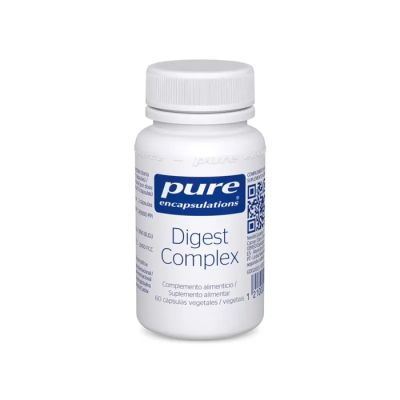 Pure Encapsulations Digest Complex es un complemento alimenticio en cápsulas vegetales formulado para respaldar el proceso digestivo en personas con necesidades de apoyo nutricional en esta área. Cada cápsula contiene una mezcla de enzimas digestivas de origen vegetal y otros ingredientes que favorecen la degradación de macronutrientes, aportando una alternativa adecuada para quienes buscan mantener un tránsito intestinal equilibrado. Está libre de gluten, lactosa y alérgenos comunes, siendo apto para dietas diversas.