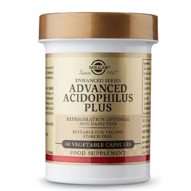 Solgar Advanced Acidophilus Plus es un complemento alimenticio en cápsulas vegetales que aporta concentraciones estandarizadas de Lactobacillus acidophilus LA-5 y Bifidobacterium lactis BB-12. Su formulación ha sido diseñada para complementar la ingesta diaria de microorganismos beneficiosos, contribuyendo al mantenimiento de un entorno equilibrado en el tracto digestivo. Está especialmente indicado para personas que buscan un suplemento de probióticos de alta calidad, con cepas resistentes a la acidez gástrica y aptas para dietas veganas.