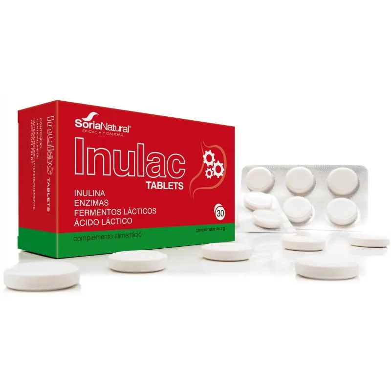 Soria Natural Inulac es un complemento alimenticio en comprimidos con inulina, ácido láctico y enzimas digestivas que contribuye al equilibrio de la flora intestinal y al correcto metabolismo de los nutrientes.