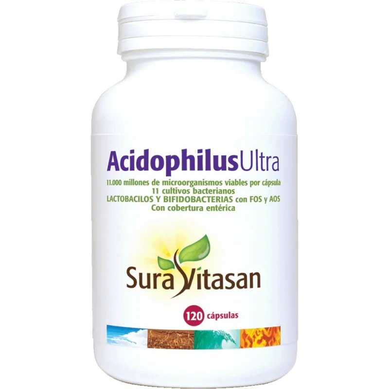Sura Vitasan Acidophilus Ultra en presentación de 120 cápsulas es un complemento alimenticio que aporta una combinación de 11 cepas probióticas de origen natural, seleccionadas por su capacidad potencial de integrarse en la microbiota intestinal y colaborar en su equilibrio. Cada cápsula contiene microorganismos vivos protegidos por un recubrimiento resistente al medio gástrico, favoreciendo su llegada al intestino. Este formato de 120 cápsulas está diseñado para un uso prolongado, permitiendo mantener una suplementación adecuada durante varias semanas y facilitar su incorporación en una rutina diaria. El envase ofrece una opción práctica para períodos de uso continuo bajo indicación profesional.