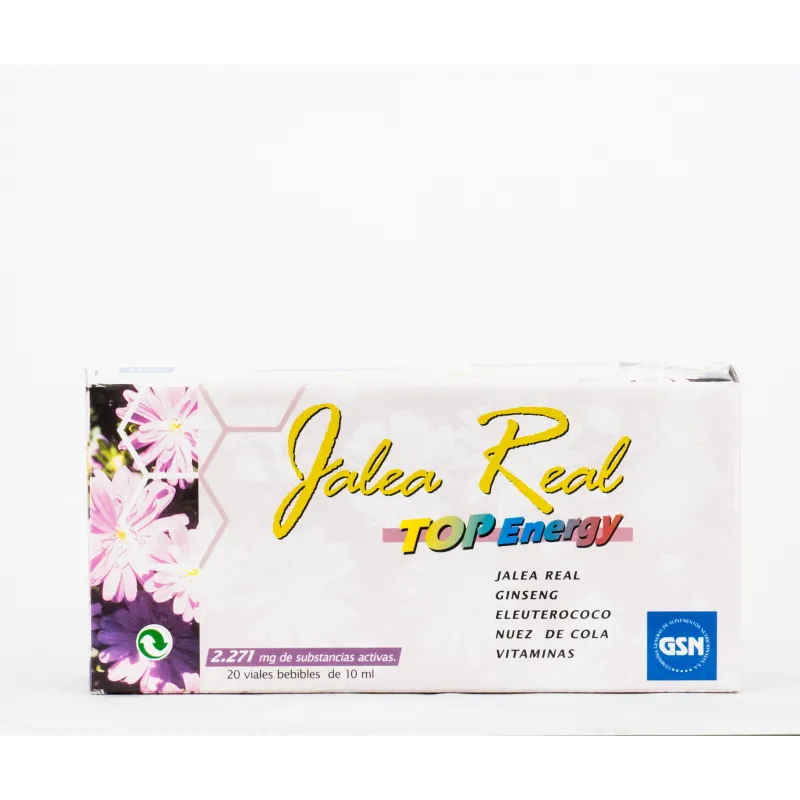 GSN Jalea Real Top Energy es un complemento alimenticio formulado con extractos vegetales y sustancias de origen apícola para complementar la dieta en momentos de mayor demanda nutricional. Su fórmula reúne componentes como extracto de ginseng, eleuterococo, nuez de cola y jalea real, seleccionados por su perfil de nutrientes esenciales. Esta combinación está diseñada para aportarte una fuente de vitaminas, minerales, aminoácidos y ácidos grasos que intervienen en múltiples funciones celulares y metabólicas.