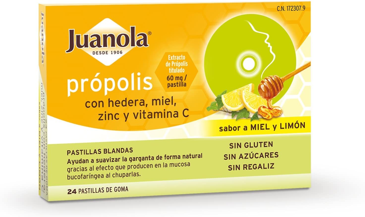 Juanola Própolis Hedera Sabor Miel y Limón es un complemento alimenticio en formato de pastillas blandas diseñado para suplementar la dieta con extractos de plantas, miel, vitamina C y zinc.