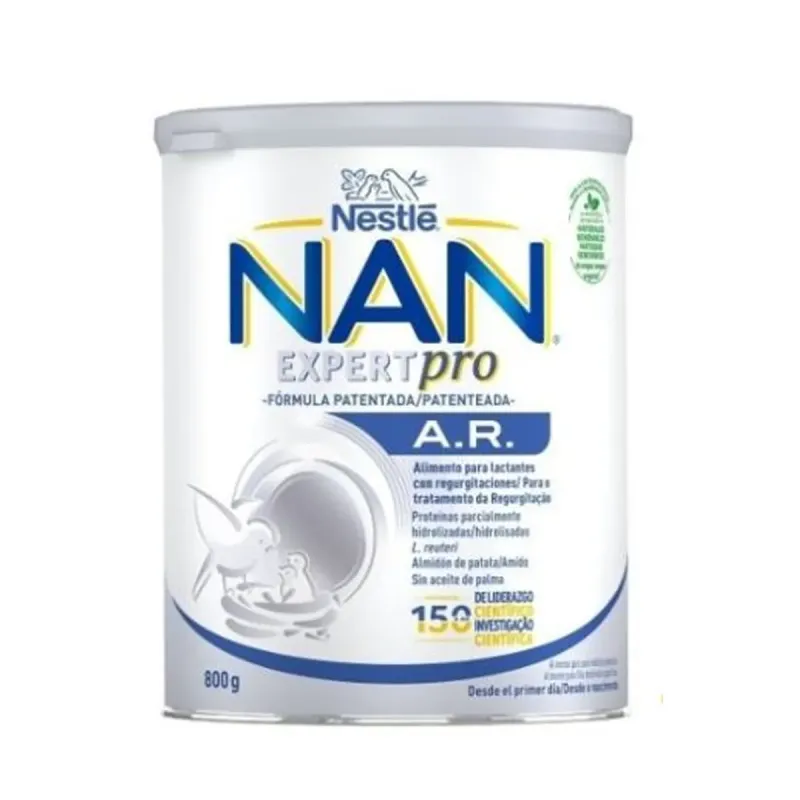 NAN AR 800G es una fórmula adaptada para bebés de 0 a 12 meses que presentan reflujo gastroesofágico o episodios de vómito. Incluye almidón de patata para aumentar la viscosidad de la alimentación, contribuyendo a estabilizar el bolo alimenticio en el estómago y facilitar su digestión. Está destinada a complementar la leche materna o como fórmula única cuando el profesional sanitario lo indique.