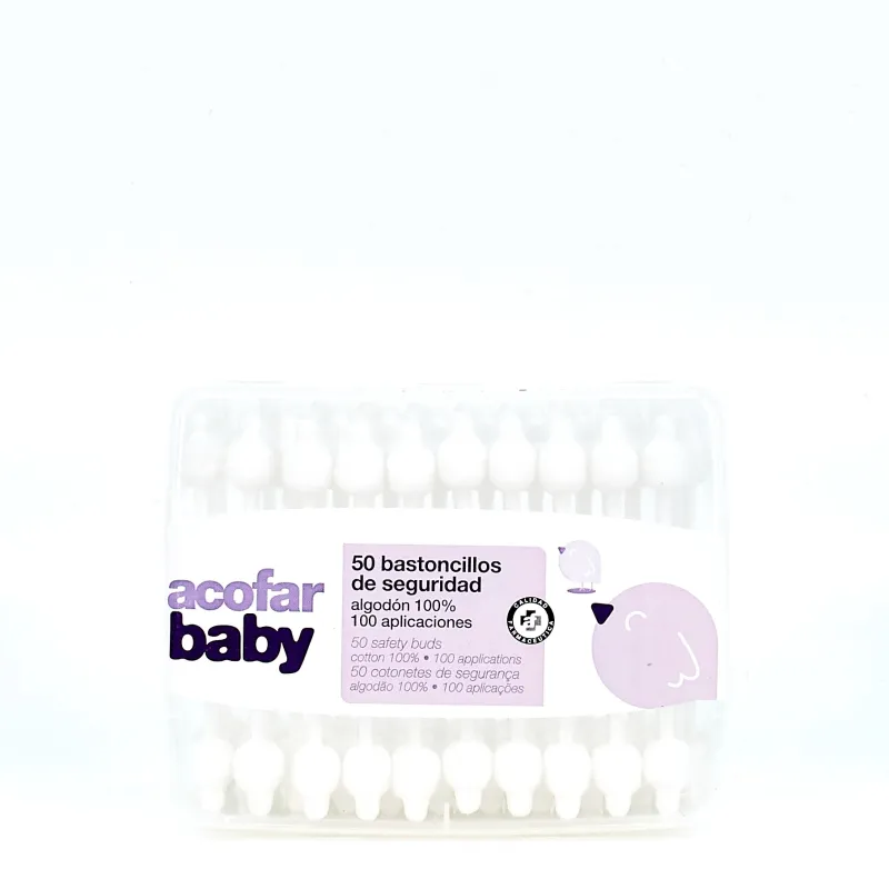 Bastoncillos para los Oídos Acofarbaby, su diseño y composición garantizan la máxima seguridad para la higiene de los oísdos y las fosas nasales de bebés y niños.