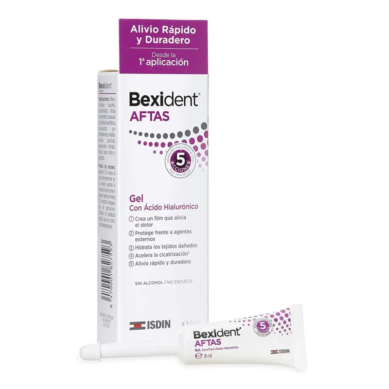 Bexident Aftas Gel proporciona un alivio inmediato y duradero a las aftas o llagas bucales. Gracias a su alto contenido en Ácido Hialurónico favorece la cicatrización y reparación de los tejidos dañados.