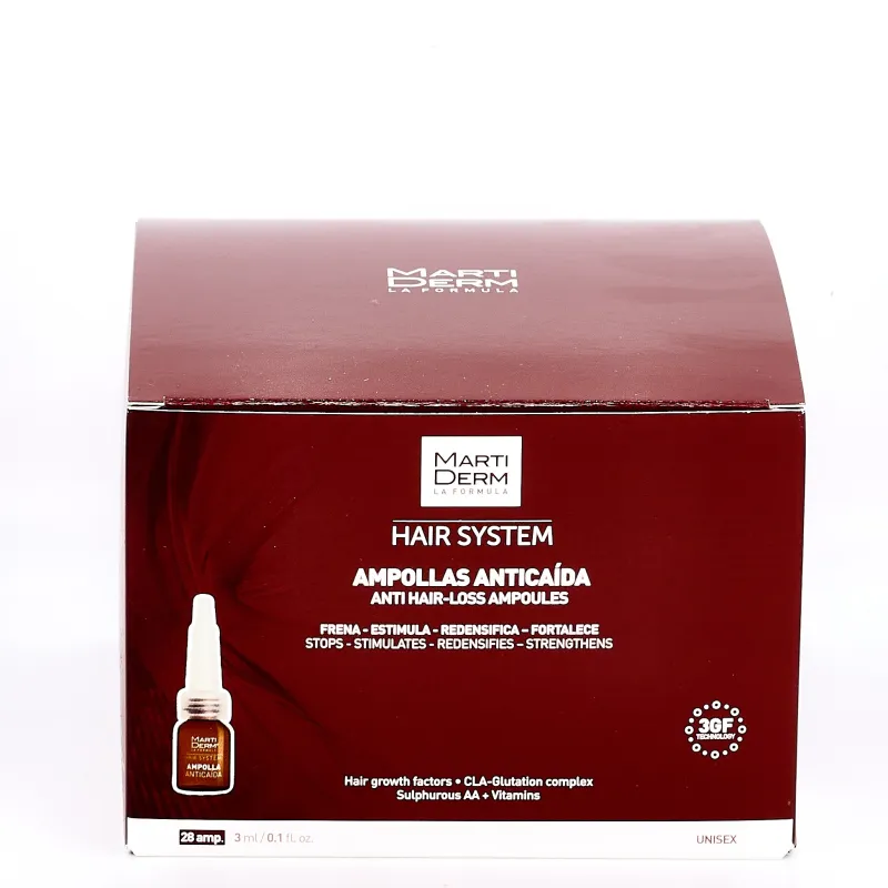 Martiderm Hair System 3GF es una línea de productos basados en la innovación biotecnológica cuya eficacia se basa en su exclusivo complejo HGFX3 que combina a la perfección 3 factores de crecimiento que actúan a diferentes niveles para frenar la caída del cabello. Tienen la capacidad de favorecer la renovación de las células, activa la circulación sanguínea, refuerza el anclaje del bulbo piloso y favorece el crecimiento de la fibra capilar.